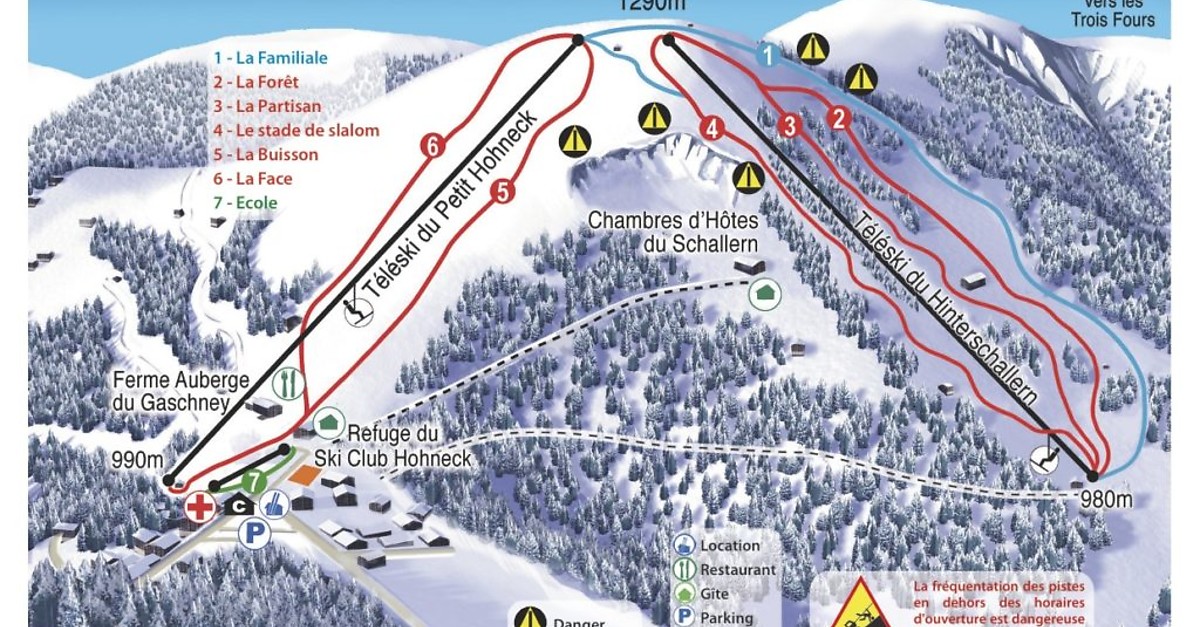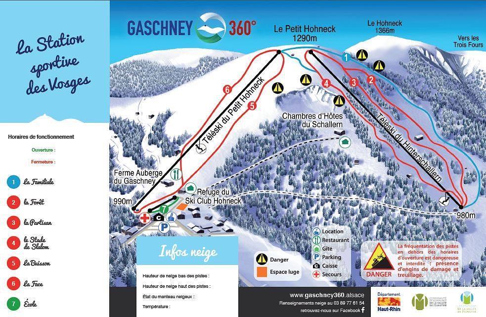 Gaschney 360 is a ski resort in the Vosges mountains of France, offering a sporty character with long slopes suitable for experienced skiers and competitors. The resort has 7 trails and is located at an altitude of 980-1290 meters. It's open on Fridays, Saturdays, and Sundays, and offers a range of activities including skiing, sledding, and dog sledding. The resort has a restaurant and is accessible by car, with nearby accommodations available.