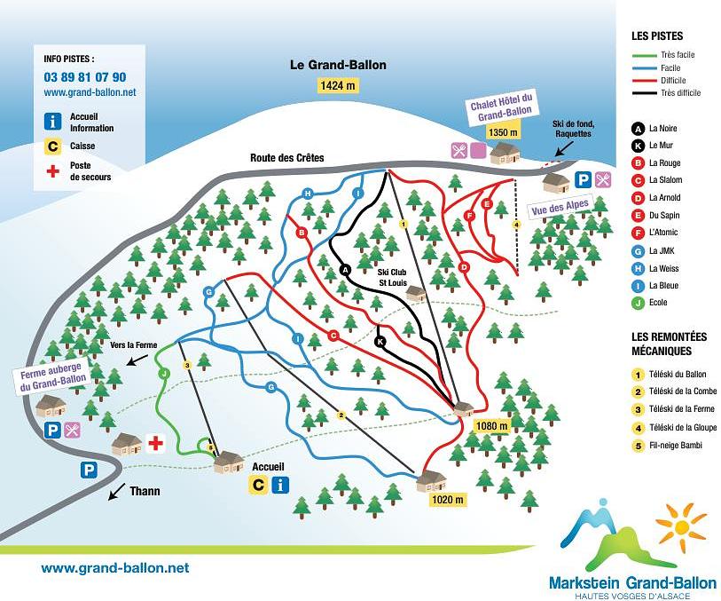 Grand Ballon is a ski resort located in the Vosges mountains of France, offering 8 slopes for all levels, served by 3 ski lifts, including a snow line for beginners. The resort has an altitude of 1,020-1,340 meters and offers breathtaking views of the Alsatian plain, the Black Forest, and the Alps. It's a great destination for skiing, snowboarding, and cross-country skiing, with a 7 km cross-country piste and a 15.3-mile hiking trail.