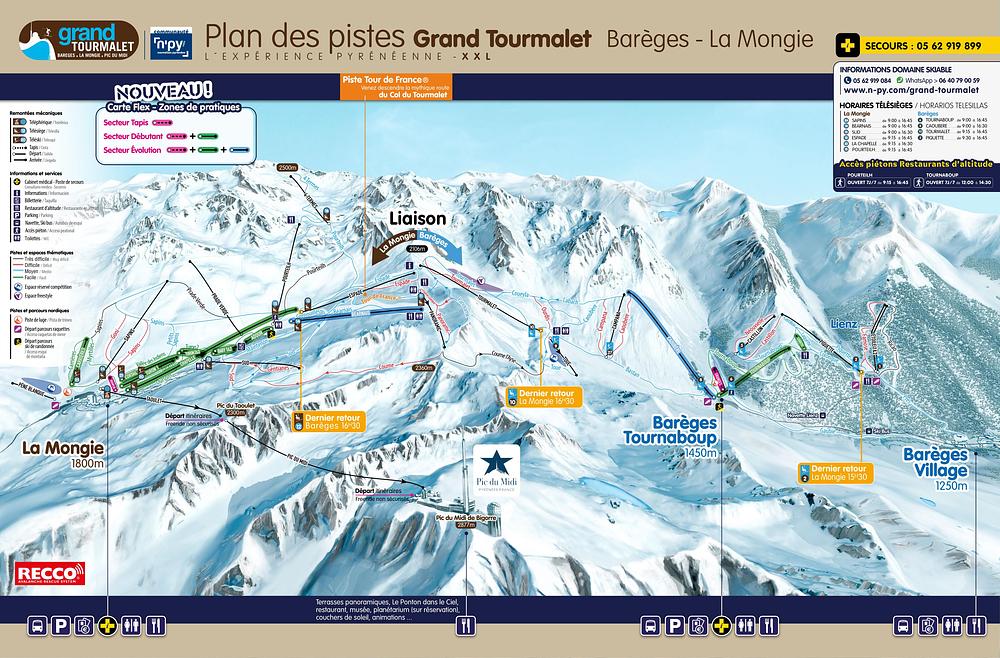 The Grand Tourmalet ski resort in the French Pyrenees offers an extensive skiing experience with over 100 km of pistes, 30 lifts, and 60 runs. It spans across two villages, Barèges and La Mongie, and boasts a vertical drop of 1250 meters. The resort caters to all levels, from beginners to experts, with diverse landscapes and activities, including snow-making capacity and breathtaking views of the Pyrenees.