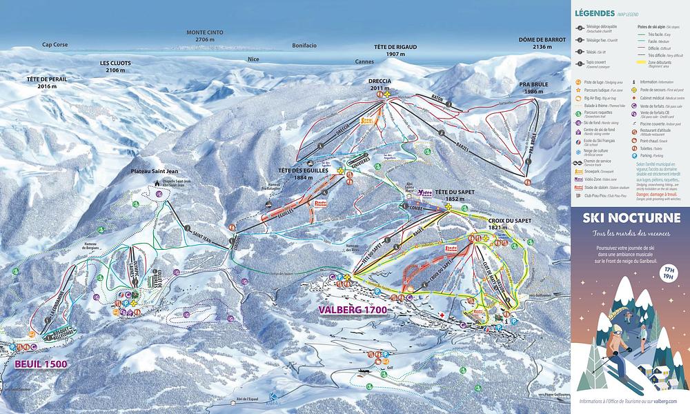Valberg is a ski resort in the French Alps, located in the Alpes-Maritimes department. It offers 56 slopes spread between 1700 and 2100 meters above sea level, making it a great destination for skiers of all levels. The resort is part of the Valberg/Beuil les Launes ski area, which boasts 90 km of alpine ski runs, 23 lifts, and 25 km of nordic ski runs. In the summer, Valberg offers hiking and biking opportunities, as well as a terrain park and snowshoeing trails. The resort is family-friendly and has been labeled "Flocon Vert" and "Famille Plus" for its welcoming atmosphere.