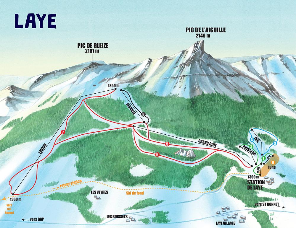 Laye is a small ski resort village in the Hautes-Alpes department of Provence-Alpes-Côte d'Azur, France. It offers 10 km of slopes, 5 lifts, and a range of winter sports activities. The village is situated at the foot of the dramatic Pic du Gleize and Aguille mountains, making it an ideal destination for skiing, snowboarding, and nature activities in winter and summer.