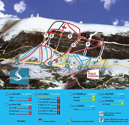 Mont Serein is a ski resort located in Beaumont-du-Ventoux, France, in the Provence-Alpes-Côte d'Azur region. It offers 12 kilometers of downhill ski slopes reaching 1,909 meters in altitude, accessible by ski lifts and conveyor belts. The resort caters to all levels, from beginners to experts, with a variety of slopes and activities. In the summer, visitors can enjoy hiking and outdoor activities. Mont Serein is a family-friendly resort with a kindergarten for learning to ski and three marked snowshoe trails.