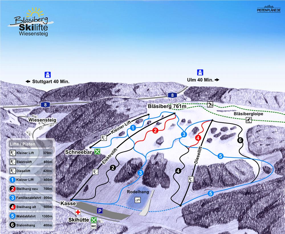 Bläsiberg Wiesensteig is a ski resort in Wiesensteig, Germany, located 50 km from Stuttgart and Ulm. It offers runs of all difficulty levels, with wide slopes in the upper part and gentle slopes for beginners. The resort has three ski lifts and 156 meters of vertical drop. It's a small ski area with mostly open slopes and some areas through the trees.