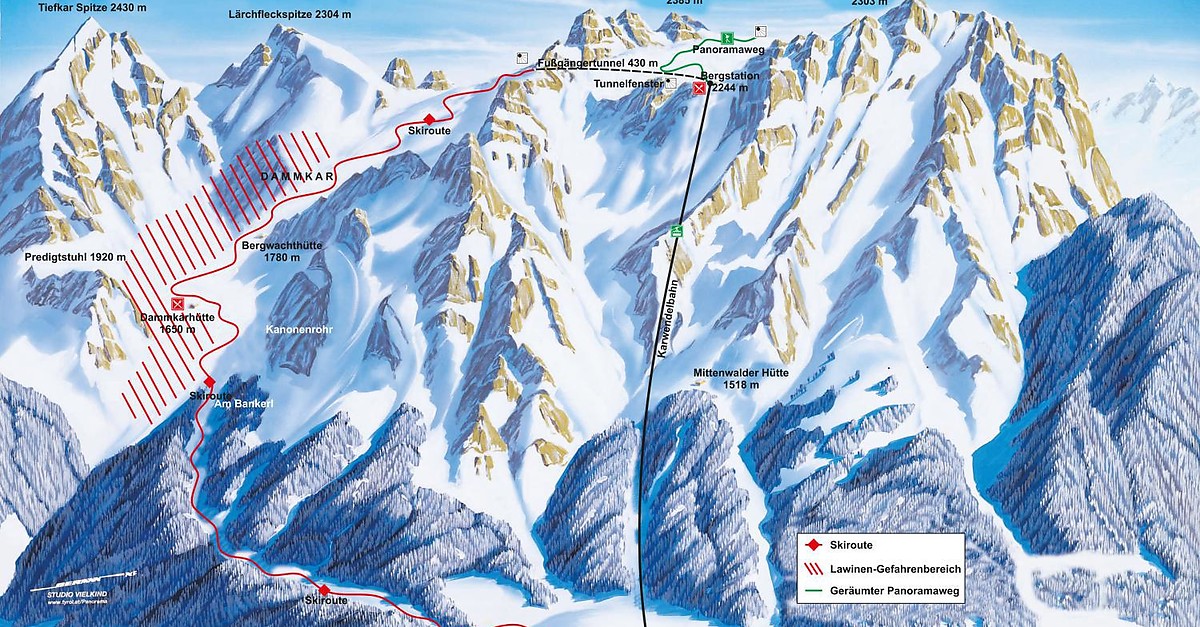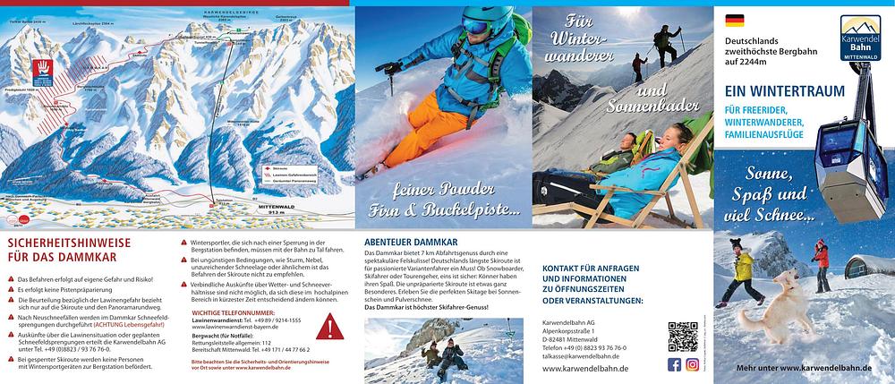 Karwendelbahn (Dammkar) is a ski resort in Mittenwald, Bavaria, Germany, offering 7 km of ungroomed, avalanche-free high alpine terrain for off-piste skiing. It's Germany's longest ski route, suitable for experienced skiers, with a gondola lift providing access to the Dammkar ski area. The resort is situated at 912 meters above sea level, making it the highest located resort in the German Alps.