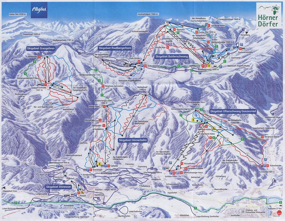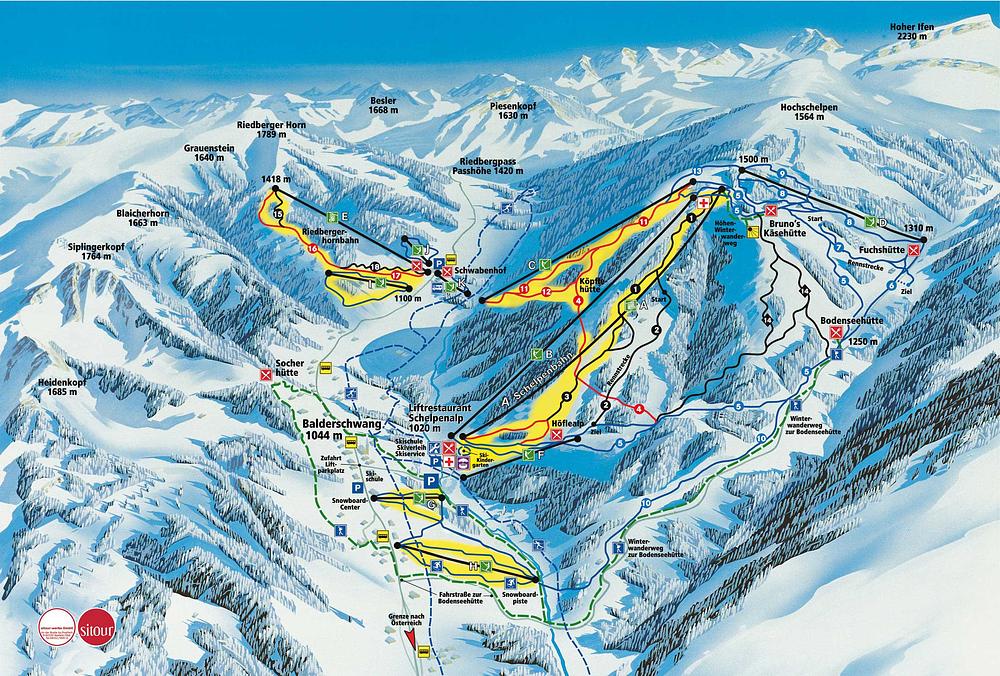 Riedbergerhorn is a ski resort located in the Allgäu Alps in Bavaria, Germany. It offers 18 kilometers of varied pistes at altitudes ranging from 1,071 to 1,687 meters above sea level, making it a great destination for families and holidaymakers. The resort has 13 ski lifts and 42 kilometers of slopes, with a mix of easy, medium, and challenging runs. Riedbergerhorn is known for its snow-sure conditions, making it a popular choice for skiers and snowboarders. The resort also features a snowpark and a wildlife reserve, adding to its appeal.