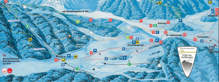 Skigebiet Ramsau - Hirscheck is a ski resort located in Ramsau bei Berchtesgaden, Bavaria, Germany. It offers a variety of winter activities, including skiing, tobogganing, and cross-country trails. The resort features a family-friendly atmosphere with easy slopes and a mountain cable car. The Hirscheck chairlift provides access to four easy slopes, and the resort also has a toboggan run and mountain restaurants. The area is surrounded by a breathtaking mountain backdrop, making it an ideal destination for winter sports enthusiasts.
