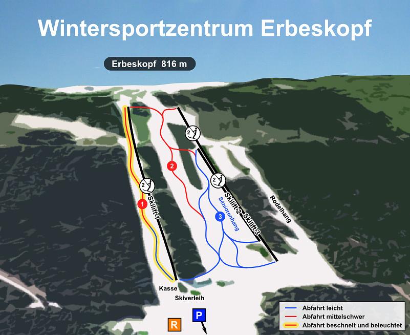 Erbeskopf is a ski resort located in the Hunsrück region of Rhineland-Palatinate, Germany. It is the highest point in the state, reaching an elevation of 816 meters. The resort offers 2.1 km of slopes for skiing and snowboarding, as well as cross-country ski trails and a summer toboggan run. It is a popular destination for winter sports enthusiasts, with 3 lifts transporting guests to the slopes.