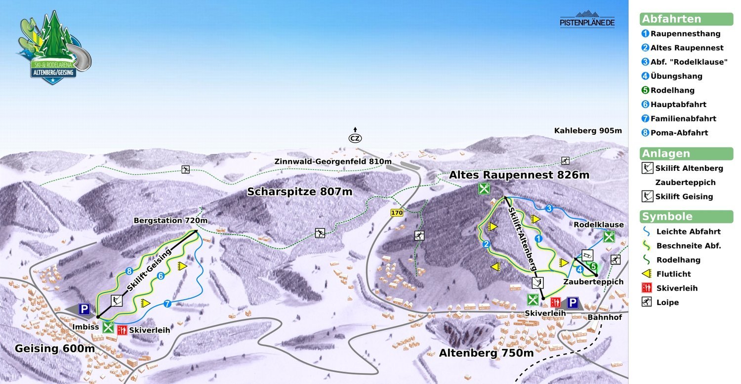 Skilift Altenberg is a ski resort located in Altenberg, Saxony, Germany. It offers a 500-meter long double drag lift, a half-pipe, and 2 km of slopes. The resort has a carrying capacity and a transit time of approximately 4:50 minutes. Night skiing is also available. The area offers 70 km of prepared cross-country ski runs and ski hiking trails, as well as guided snowshoe hikes. The resort has a vertical descent of 76 meters and 1 km of skiable terrain.