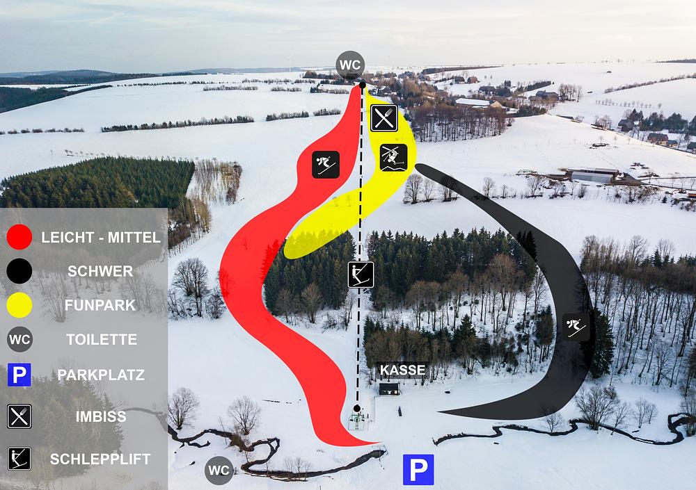 Skilift Hermsdorf is a ski lift located in Hermsdorf, Saxony, Germany. It's a T-bar lift with a length of 688 meters and a carrying capacity of 1000 people per hour. The ski resort is part of the Am Richtergrund (Massive Snowpark) area, which offers a variety of slopes for skiers and snowboarders. The lift is situated at an elevation of 720 meters and offers stunning views of the surrounding Erzgebirge mountains.