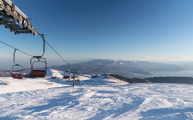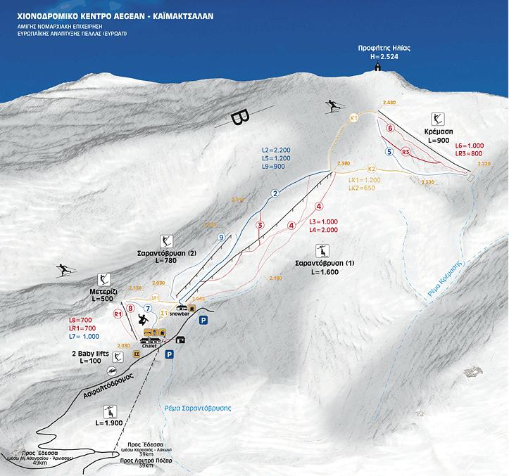 Kaimaktsalan is a ski resort located on Mount Voras, the third-highest mountain in Greece, with an altitude of 2,524 meters. The resort offers 6 ski lifts, 13 ski runs, and 4 ski trails, covering a total length of 15 km. It has a variety of slopes for different skill levels, including 4 red, 4 blue, 3 beginner, and 2 langlauf slopes. The resort is open from early December to early April, with operating hours from 9:00 AM to 4:00 PM. Visitors can enjoy skiing, snowboarding, and hiking in the area, as well as relax in the nearby hot springs. The village of Agios Athanasios at the foot of the mountain offers accommodation options and amenities.