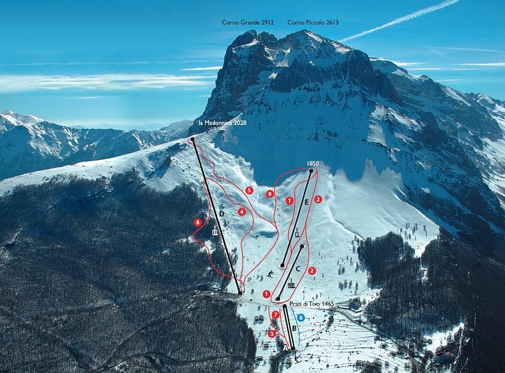 Prati di Tivo is a ski resort located in the Abruzzo region of Italy, near the village of Pietracamela. It offers 7.5 km of slopes, 4 lifts, and 9 ski runs, as well as cross-country skiing opportunities. The resort is situated at an altitude of 1449-2007 meters and features a chairlift and 5 skilifts. Prati di Tivo is a popular destination for winter sports enthusiasts, with a range of activities and amenities available, including restaurants, shops, and accommodations.