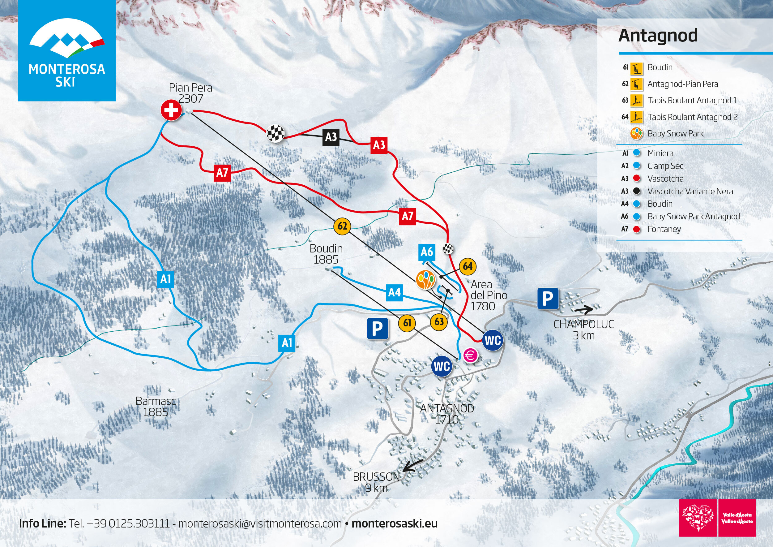 Antagnod is a ski resort located in the Aosta Valley, Italy, on the western side of the Ayas Valley. It offers 11 km of slopes, with 7 runs, including 4 blue, 2 red, and 1 black, and 4 lifts, including 2 chairlifts and 2 tapis roulants. The resort is situated at an altitude of 1,734 meters and has a top station at 2,307 meters, with spectacular views of the surrounding mountains and valleys. It's a great destination for family holidays, with services catering to both adults and children.