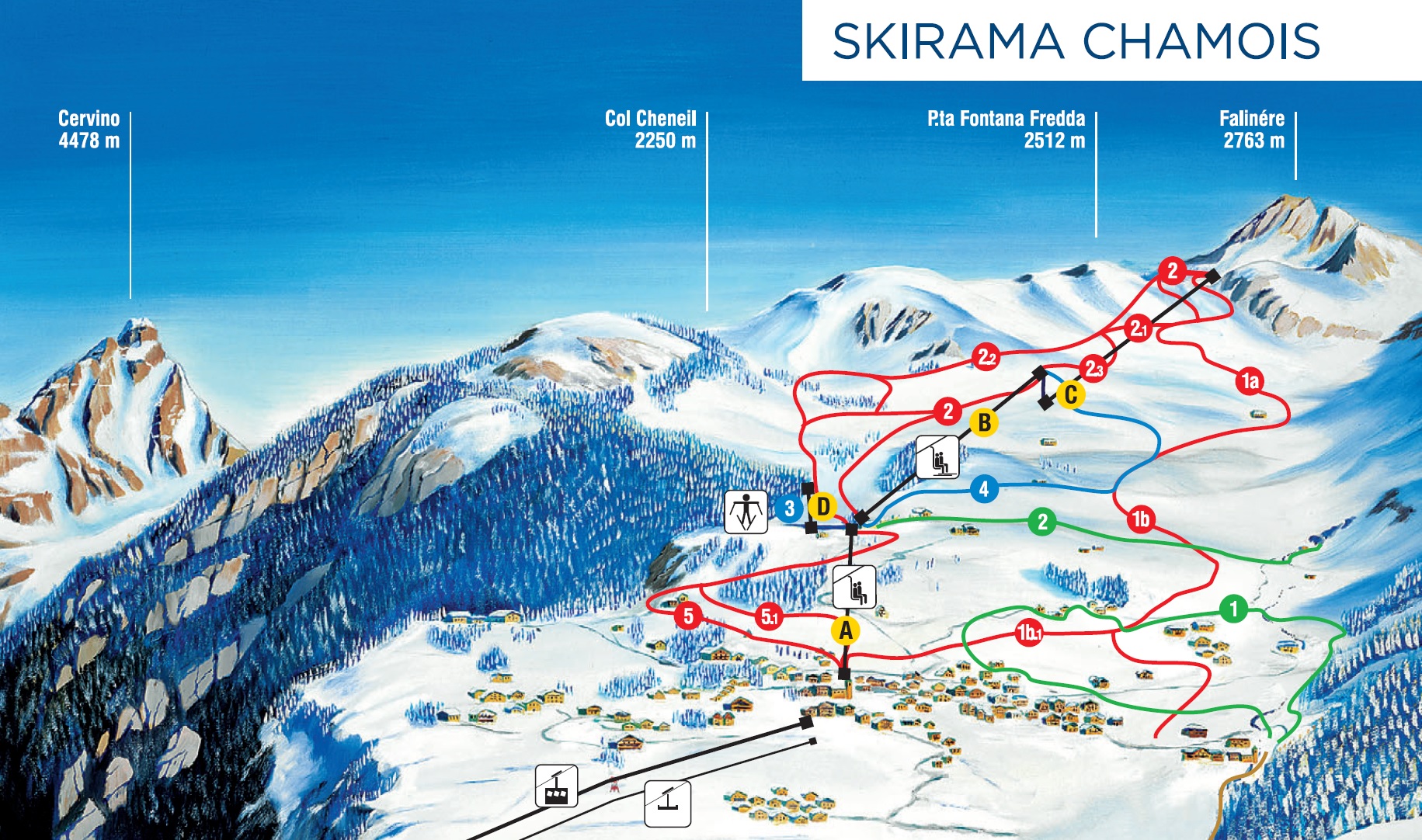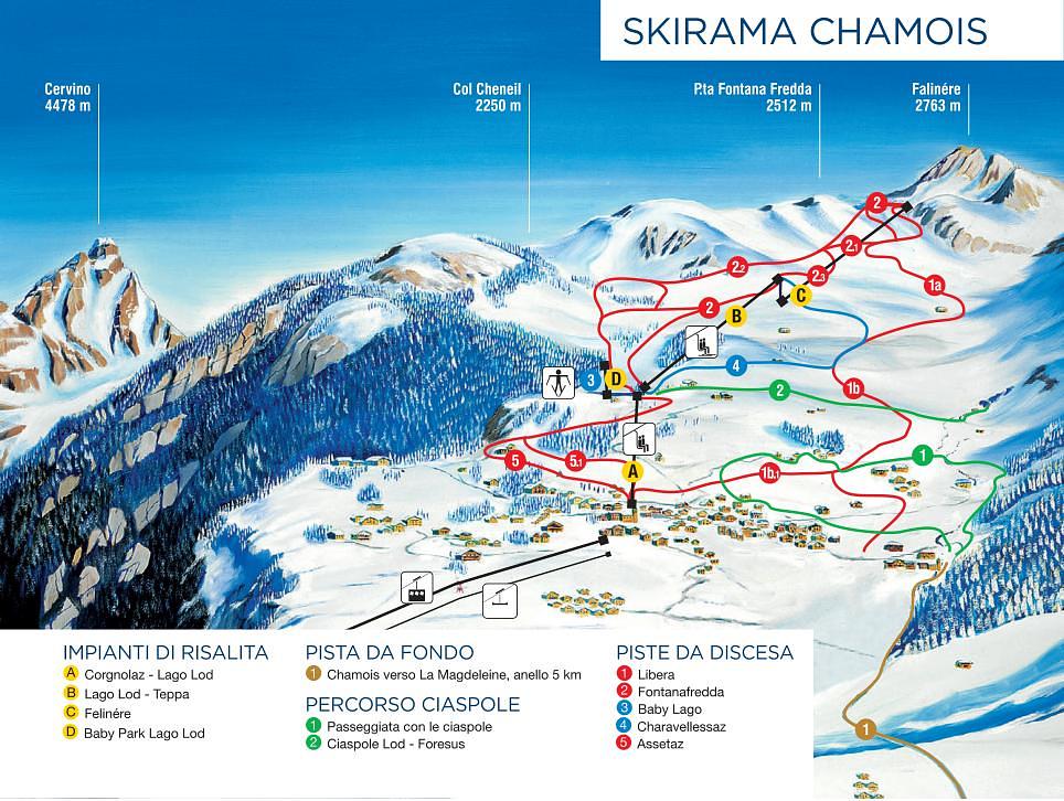 Chamois is a charming ski resort in the Aosta Valley, Italy, offering 16 km of slopes for all skill levels, including 14 km covered by snow cannons. The resort has 5 lifts, a ski school, and a variety of winter activities such as snowshoeing and paragliding. It's a family-friendly destination with a range of difficulty levels, from beginner to expert. Chamois is situated at an elevation of 1800-2500 meters, making it an ideal spot for those seeking a peaceful and serene winter experience.