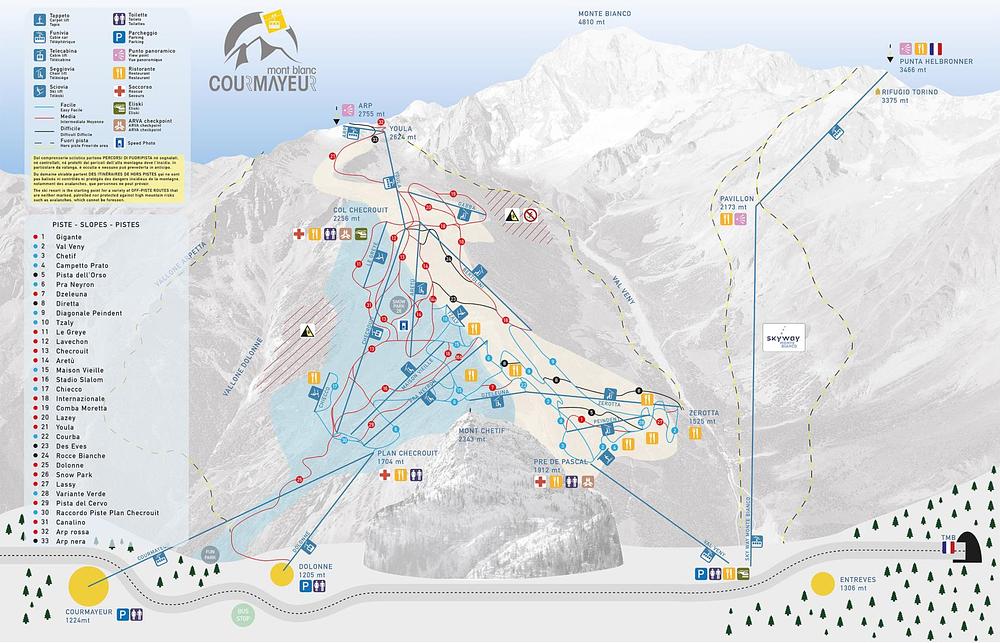 Courmayeur is a world-renowned ski resort in the Aosta Valley, Italy, offering unparalleled skiing and snowboarding with extensive, well-groomed slopes. Located near the French border, it's a top choice for all skiers, with a lively village and stunning restaurants. The resort boasts 41.5 kilometers of pistes, 18 lifts, and altitudes ranging from 1,205 to 2,755 meters. Its diverse terrain and scenic views make it a popular weekend destination for Northern Italian skiers.