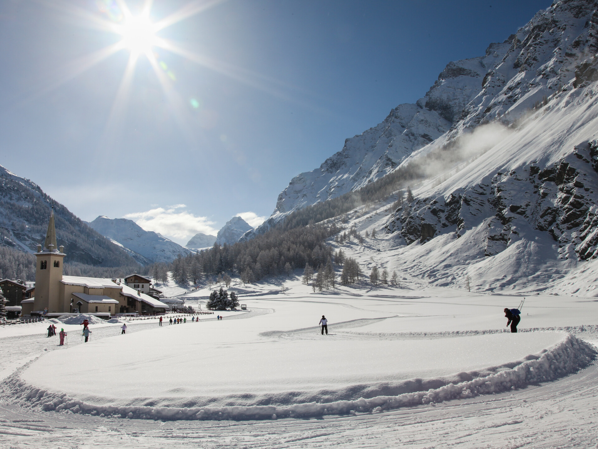 Rhemes-Notre-Dame is a small ski resort in the Aosta Valley, Italy, offering a range of slopes for all levels, including 17 km of cross-country trails and 7 km of downhill skiing. The resort has two skiing areas, Chanavey and Rhêmes Notre Dame, with a total of 6 km of slopes covered by artificial snow. It features 1 chairlift, 1 surface lift, and a magic carpet for kids. The resort is surrounded by majestic mountains, forests, and green meadows, and is a great destination for those seeking a peaceful and serene skiing experience.
