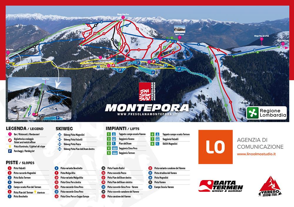 Monte Pora is a ski resort in the Italian Alps, located in the Lombardy region. It offers 30 kilometers of ski slopes with a modern snowmaking system, catering to all skill levels. The resort features chair lifts, a ski school with English-speaking instructors, and a variety of outdoor activities, including mountain biking in the summer. With its picturesque surroundings and family-friendly atmosphere, Monte Pora is an ideal destination for those seeking a fun and relaxing mountain experience.
