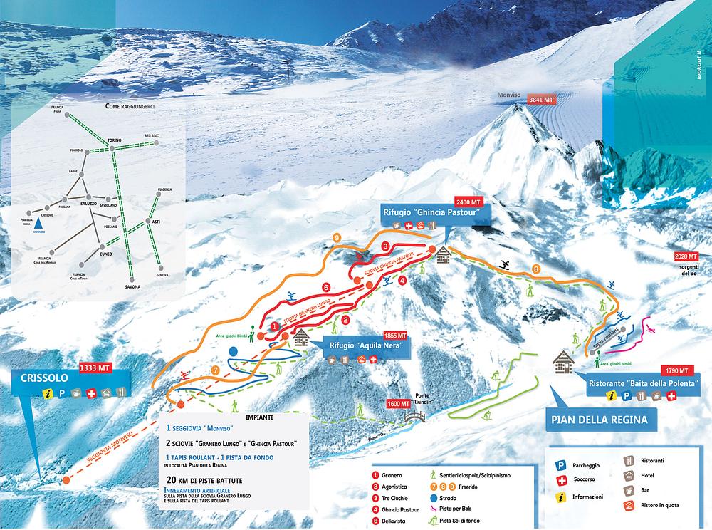 Crissolo, a ski resort in the Province of Cuneo, Italy, offers a small but impressive ski area with 10 km of slopes and three lifts. The resort is located near the source of the River Po and is part of the Monviso ski district. Crissolo is a family-friendly destination with a variety of slopes for all levels, including cross-country skiing facilities. The resort has received mixed reviews, with an average rating of 2.3 out of 5 stars.