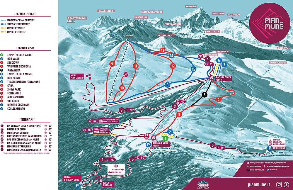 Pian Munè is a ski resort located in the Province of Cuneo, Italy, in the Piedmont region. It offers 16 km of skiable terrain, with 8 pistes suitable for beginner, intermediate, and expert skiers. The resort has 4 lifts, including 1 double chairlift and 3 surface lifts, with a vertical drop of 560m. The highest point of the resort is 2060m, while the base elevation is 1500m.