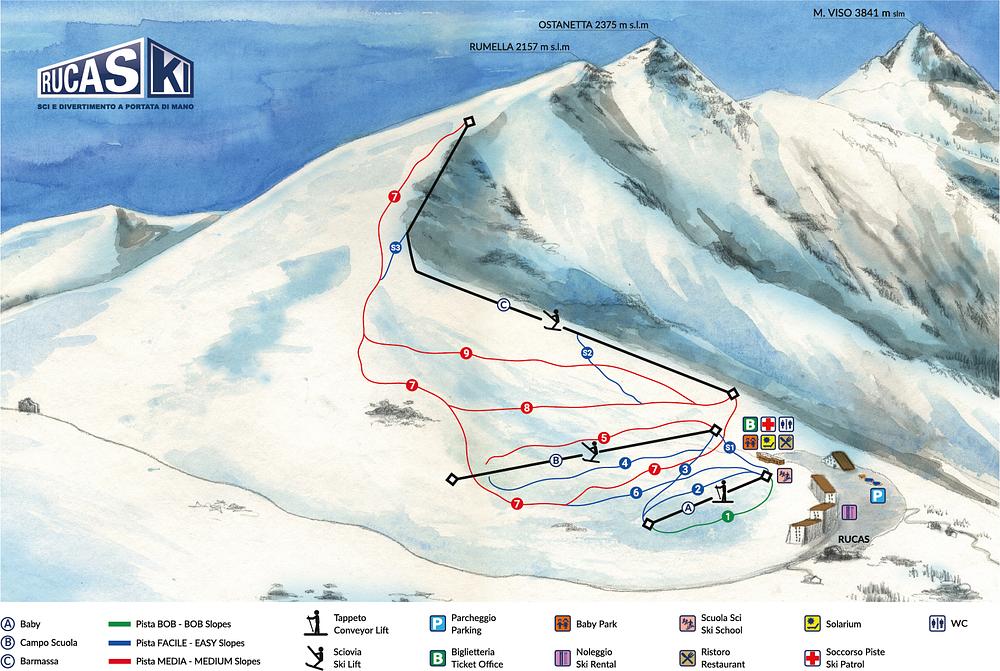 Rucaski is a ski resort located in Bagnolo Piemonte, Italy, in the Piedmont region. It offers a range of winter sports activities, including skiing and snowboarding, with 3.6 km of slopes suitable for beginners. The resort is known for its family-friendly atmosphere and modern facilities. It's an ideal destination for those looking to learn to ski or snowboard, with a focus on gentle slopes and beginner-friendly terrain.