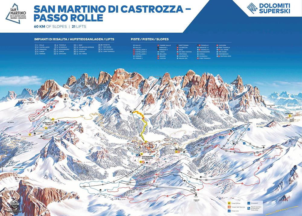 San Martino di Castrozza - Passo Rolle is a ski resort in the Dolomiti Superski area, boasting 60 km of slopes between 1404 and 2357 meters in altitude. The resort offers a unique natural landscape with varied terrain, including 15 km of slopes for all levels, from easy to challenging. It's an authentic and off-the-beaten-path destination with a relaxing atmosphere, making it an ideal spot for both expert and beginner skiers.