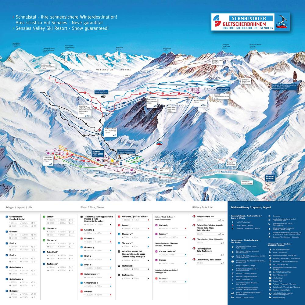 Schnalstal is a ski resort located in the Val Senales valley in South Tyrol, Italy. It offers 42 kilometers of pistes and 13 lifts, with snow guaranteed from September to May. The resort is situated at an altitude of 2,000 meters and offers a range of slopes for all levels, including beginner, intermediate, and advanced trails. The village of Maso Corto, also known as Kurzras, is located at the foot of the resort and offers amenities such as restaurants, shops, and ski rental services. The Schnalstal glacier cable car brings skiers from the village to the top of the resort, providing access to the slopes.