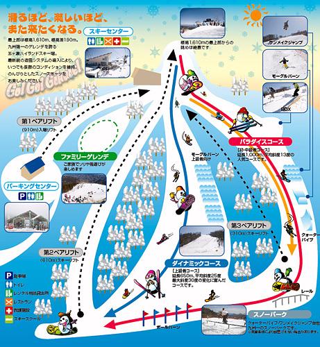 Gokase Highland is Japan's southernmost natural ski resort, located on the northeastern slopes of Mt. Mukozaka in central Kyushu. It offers 1.8 km of slopes, 3 lifts, and 2 courses, as well as equipment rentals and lessons. The resort has a relatively gentle slope and is known for its natural snow quality. It's a popular spot for skiing and snowboarding, with spectacular views of Mt. Aso from the summit at 1,610 meters tall.
