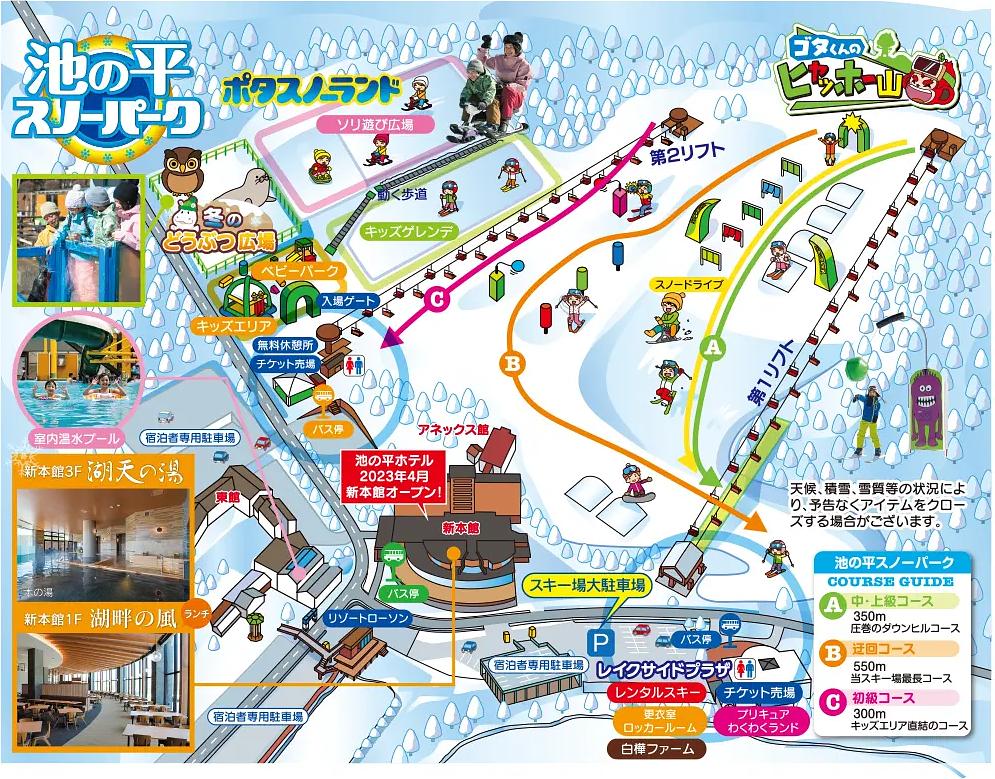 Ikenotaira Snow Park, located in Tateshina, Nagano Prefecture, Japan, is a family-friendly ski resort with a variety of slopes for beginners and intermediate skiers. The resort features a snow park, sled slopes, and a petting zoo, making it an ideal destination for families. With a ski-in/ski-out system, guests can easily access the slopes from the resort. The resort offers a range of amenities, including a ski rental shop, restaurants, and accommodations.