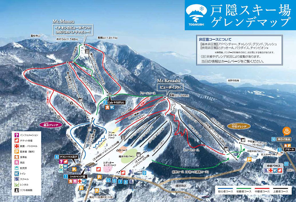 Togakushi Ski Resort in Nagano, Japan is a small but enjoyable ski area with 58 hectares of piste and 19 courses, catering to beginners, intermediates, and advanced skiers. It's known for its regular snowfalls and excellent powder snow, with a 600m vertical drop and 20km of runs. The resort is surrounded by beautiful mountains and offers a variety of slopes, including a freestyle park with 10 obstacles. It's a popular spot for locals and visitors alike, with friendly staff and a range of amenities, including a soba restaurant.