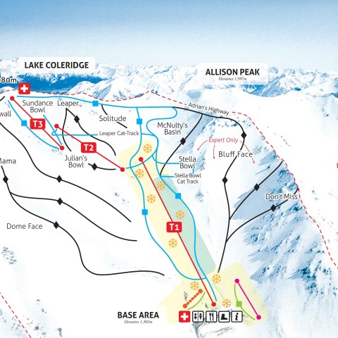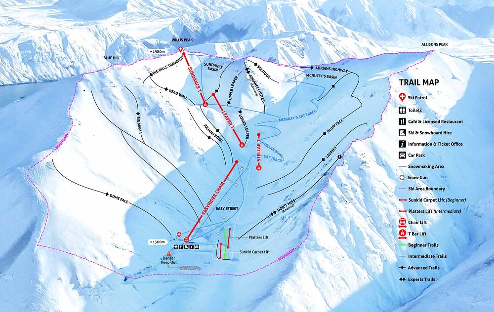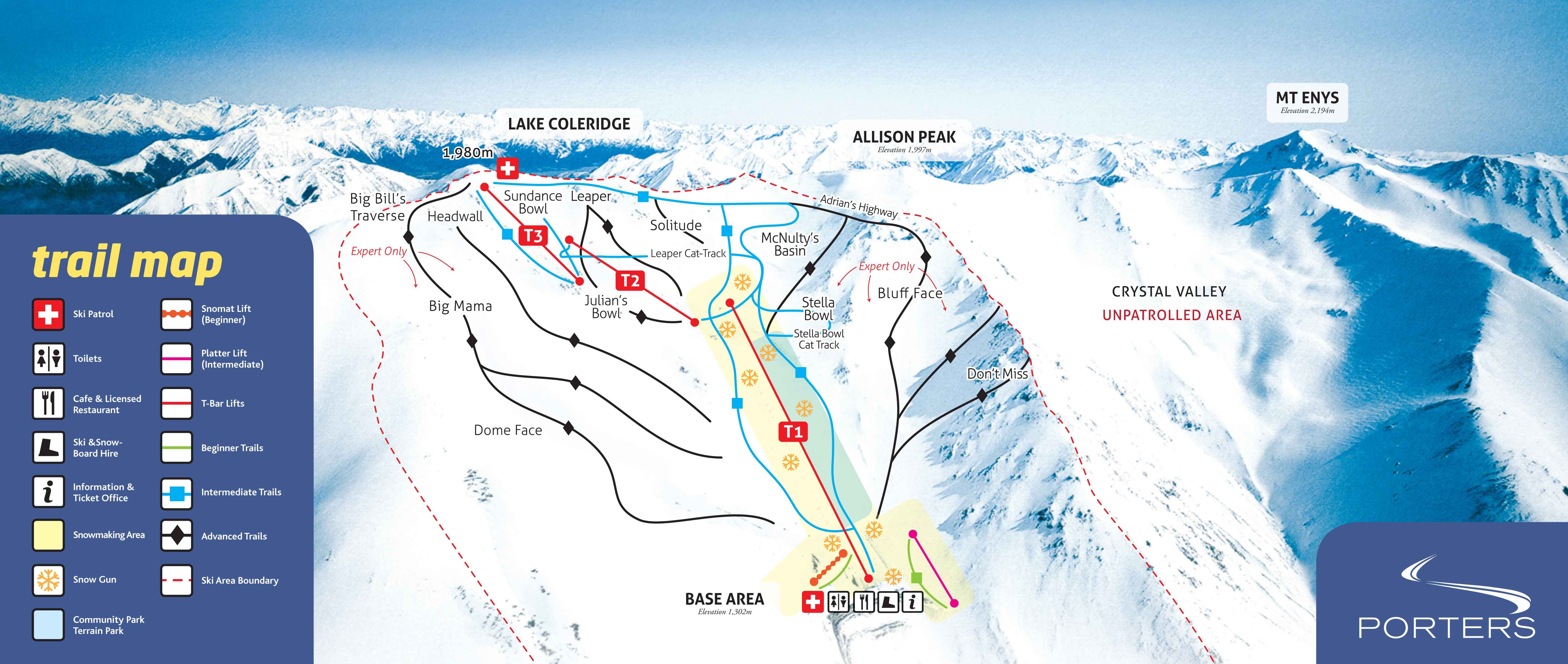 Porters Ski Area in Canterbury, New Zealand, is a family-focused ski resort located just over an hour's drive west from Christchurch. It offers a range of ski and snowboard terrain for all abilities, with one beginner magic carpet, one platter tow, one chairlift, and three T-bar lifts. The resort has a skiable area of 700 hectares, with a top elevation of 1,995 meters and a base elevation of 1,302 meters. In the summer, Porters offers mountain biking and bouldering opportunities.