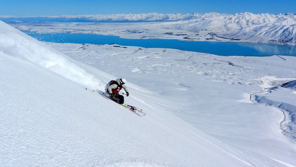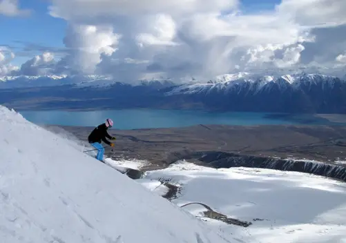 Roundhill Ski Field in Canterbury, New Zealand, is a family-friendly ski area with breathtaking views of Aoraki Mt Cook, the Southern Alps, and Lake Tekapo. It offers 18 km of slopes, a beginner's area, and a cozy cafe and rustic après-ski bar. The ski field is 30-35 minutes from Lake Tekapo township and is known for its friendly hospitality, fantastic snow, and all-day sun. It's a great option for families and those looking for a more laid-back skiing experience.