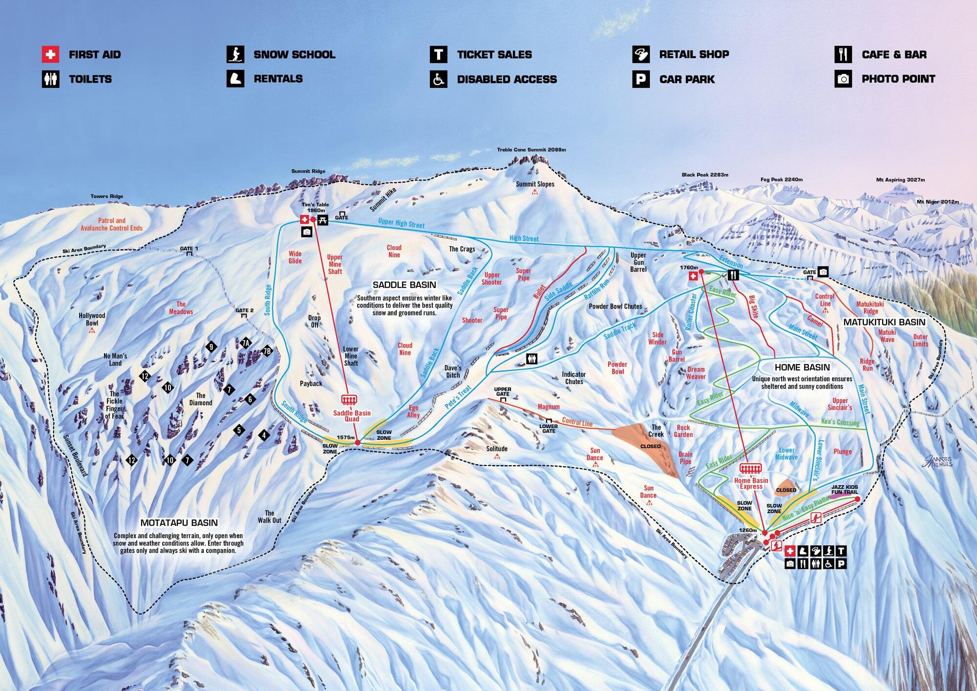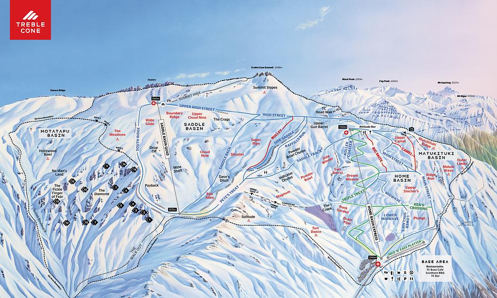 Treble Cone Ski Area is the largest ski resort in New Zealand's South Island, boasting the longest vertical rise in the Queenstown Southern Lakes District. With over 600ha of skiable terrain, it offers thrilling slopes, abundant powder, and breathtaking scenery. The resort features a high lift capacity of 6200 skiers, two terrain parks, and a base elevation of 1260m. Treble Cone is known for its expert-level runs and scenic views, making it a popular destination for experienced skiers and snowboarders.
