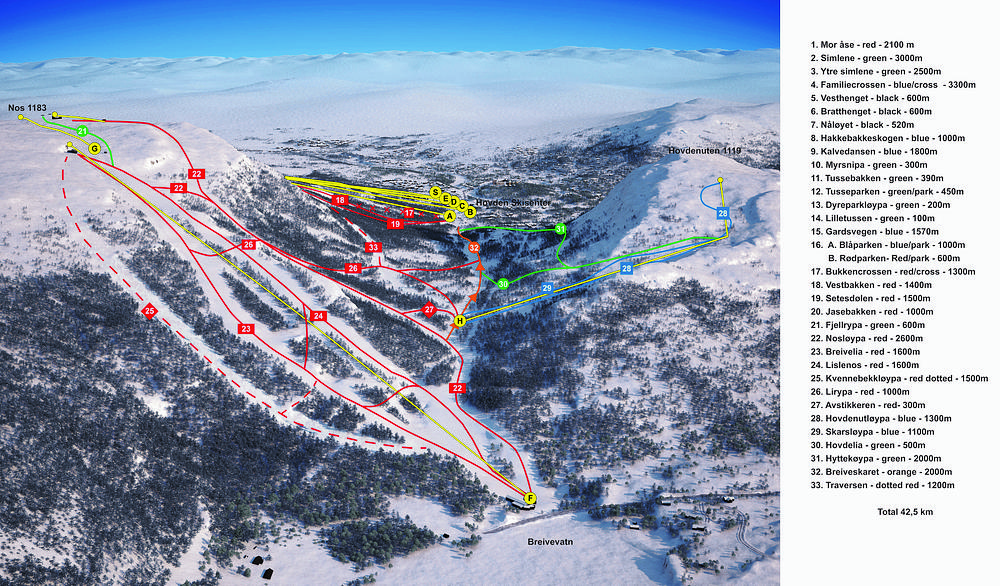 Hovden is a ski resort located in the upper Setesdal region of Norway, offering a variety of slopes for all skill levels. The resort boasts 42 kilometers of alpine slopes, a vertical drop of 420 meters, and 33 slopes, with two 4-seat express lifts and five ski tows. It also features a children's area, cross-country skiing trails, and a terrain park. With reliable snow cover and a range of amenities, Hovden is a popular destination for winter sports enthusiasts.