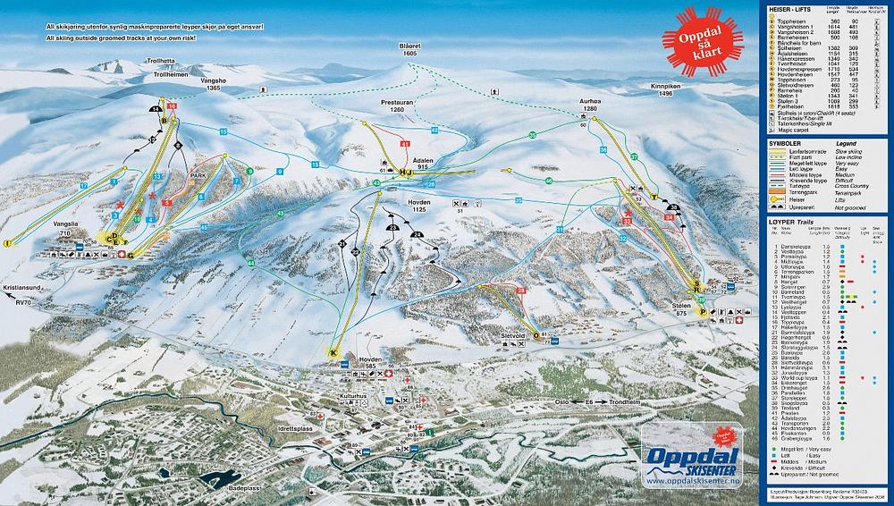 Oppdal is a ski resort located in Norway, specifically in the Sør-Trøndelag region. It's one of the largest ski resorts in Norway, covering an area of four mountains with 35 slopes and 13 lifts. The resort offers a variety of skiing and snowboarding opportunities, with 56 km of slopes and a range of difficulty levels. Oppdal is known for its natural terrain and extensive skiing experience, making it a popular destination for winter sports enthusiasts.