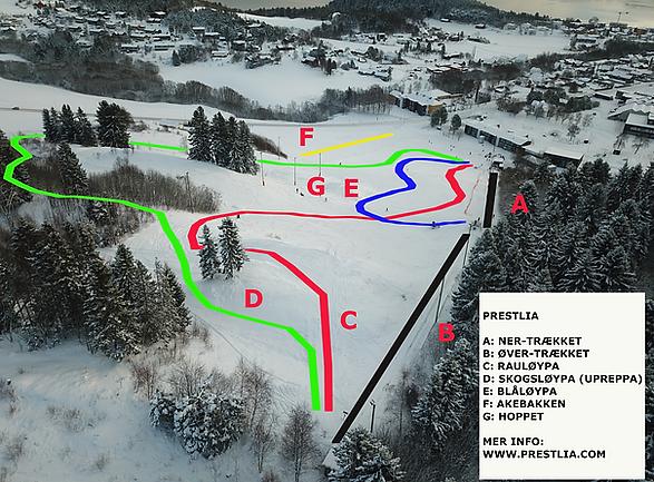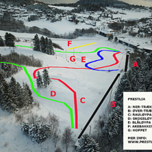 Prestlia is a ski resort located in Inderøy, Norway. It features a 300-meter long slope with a 75-meter drop, offering a 50-year-old ski trail. The resort is open on specific days and hours, with varying schedules for different days of the week.