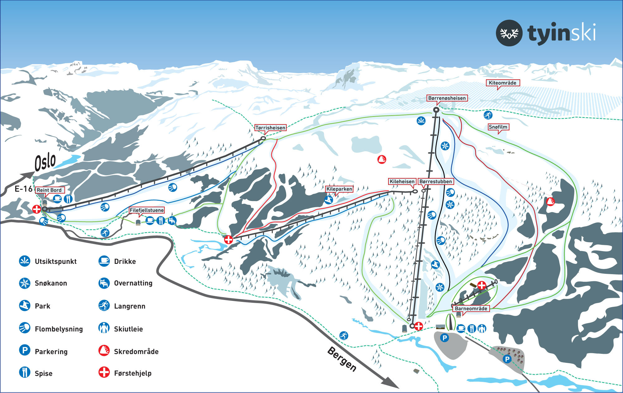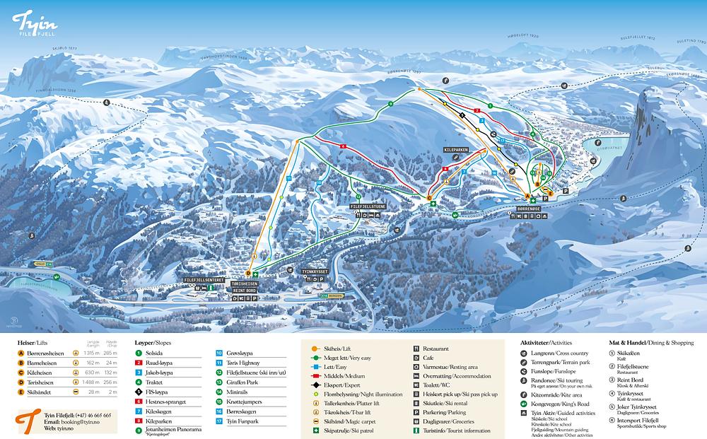 Tyin-Filefjell is a ski resort in Norway, located in the Valdres region of Oppland. It offers 14 prepared slopes with a total of 17 km of skiing terrain, suitable for off-piste skiers. The resort has 5 lifts and a highest point of 1282 meters, with a 450-meter drop. The area also offers cross-country skiing and snowshoeing opportunities, with 250 km of prepared trails.
