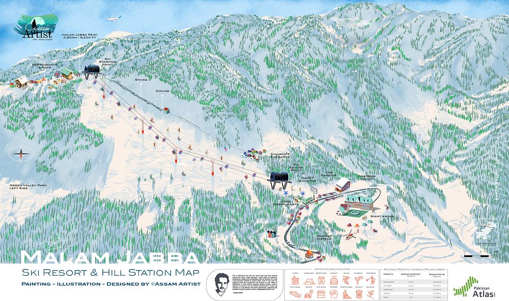 Malam Jabba is a hill station and ski resort in the Hindu Kush mountain ranges of Khyber Pakhtunkhwa, Pakistan. It's located 40 km from Saidu Sharif in the Swat Valley and is the only ski resort in Pakistan. The resort offers a range of recreational activities, including chairlift, zipline, human slingshot, and giant swing, with scenic views of the surrounding valley. It's a popular winter destination, with a top elevation of 2,804 meters (9,199ft) and a range of accommodations, including hotels and restaurants.