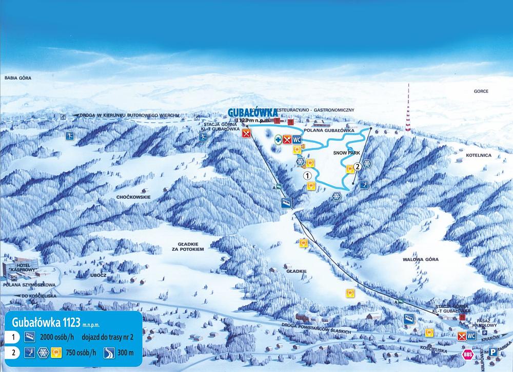 Gubałówka is a ski resort located in Zakopane, Poland, offering a range of slopes for all skill levels. The resort features artificial snow and partially illuminated slopes, making it an ideal destination for both beginners and experienced skiers. With a funicular and 120-person capacity, Gubałówka provides a convenient and enjoyable skiing experience. The resort is open from mid-December to late March, with operating hours from 9:00 AM to 6:00 PM.