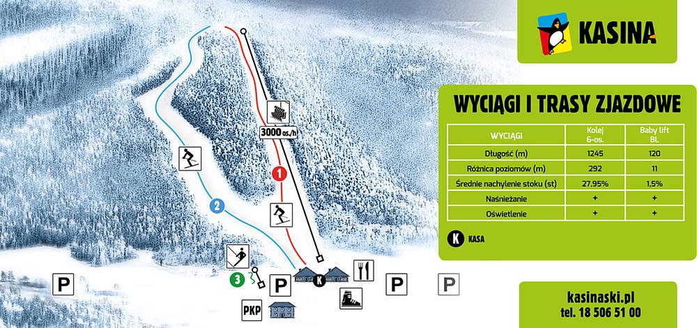 Kasina Wielka is a ski resort in Lesser Poland Voivodeship, Poland, offering 2.9 km of slopes for skiing and snowboarding. The resort is located 1.4 km from the village center and is known for its artificially snowed and lit slopes. Kasina Ski&Bike Park is a popular destination for winter sports enthusiasts, with a variety of trails and activities. The resort is easily accessible from Krakow, just 1.5 hours away.