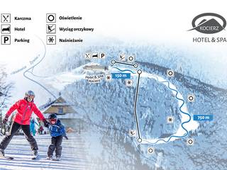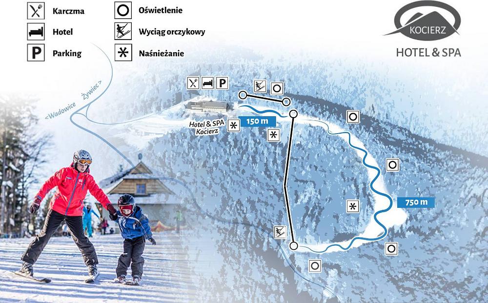 Kocierz is a ski resort located in the Lesser Poland Voivodeship, Poland, at an elevation of 750 meters above sea level. It offers 1.6 km of slopes for skiing and snowboarding, with a 550m long ski slope and a platter lift. The resort features a hotel with a spa, swimming pool, and other amenities, as well as a restaurant and bar. It's situated in the heart of the Beskid Mały Landscape Park, offering scenic views and a range of recreational activities.