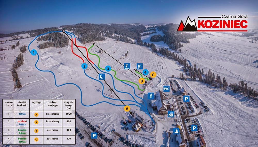 Koziniec SKI in Czarna Góra, Poland offers gentle alpine slopes for skiing and snowboarding, with lessons available for kids and adults. The ski resort has 2.2 km of slopes and a four-seater chairlift. It's located near Białka Tatrzańska and Zakopane, and offers a restaurant on site. The resort has received 4.5 out of 5 stars based on 2,682 Google reviews, with a 3-star rating on Bergfex.