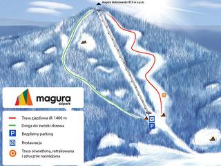 Magura Skipark is a ski resort located in Małastów, Lesser Poland, Poland. It features 1.4 km of slopes, a 4-person chairlift with a capacity of 2200 people per hour, and artificial snowmaking capabilities. The resort is situated on the slope of Magura Małastowska, with a summit elevation of 813 meters above sea level. The slopes are well-maintained and equipped with snowmaking and lighting systems. Reviewers praise the resort's efforts to improve the skiing experience, but some note that the slopes can be rocky and time-consuming to navigate.