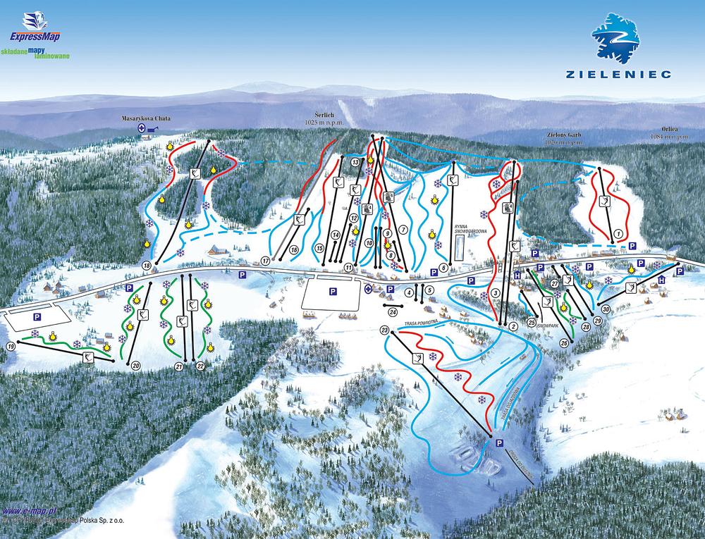 Zieleniec is a ski resort located in Duszniki-Zdrój, Lower Silesian Voivodeship, Poland. It offers 21.6 km of slopes for skiing and snowboarding, with 31 lifts. The resort has a rich history, dating back to the 19th century, and is a popular destination for both beginners and experienced skiers. It features a range of slopes for all skill levels, including illuminated routes for night skiing. The resort also offers disc golf and panoramic views. Prices for ski passes and parking are similar to other resorts, with free parking available.