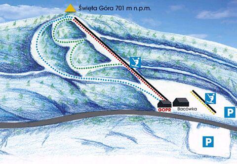 Święta Góra is a ski resort located in the Lower Silesian Voivodeship, Poland. It offers 3 km of slopes for skiing and snowboarding, with 2 lifts transporting guests between elevations of 500 and 701 meters. The resort is situated in the Lubawka area, providing a range of winter sports activities for visitors.