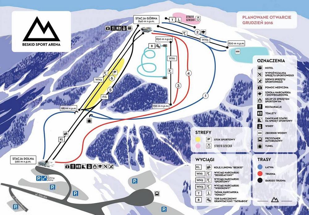 Beskid Sport Arena is a compact ski resort in Szczyrk, Poland, offering 3.2 km of slopes with 4 trails for skiers and snowboarders of all levels. The resort features equipment rental, a burger restaurant, and a base altitude of 600m with a summit altitude of 840m. It's a great destination for a ski holiday, with a variety of slopes and amenities to enjoy.
