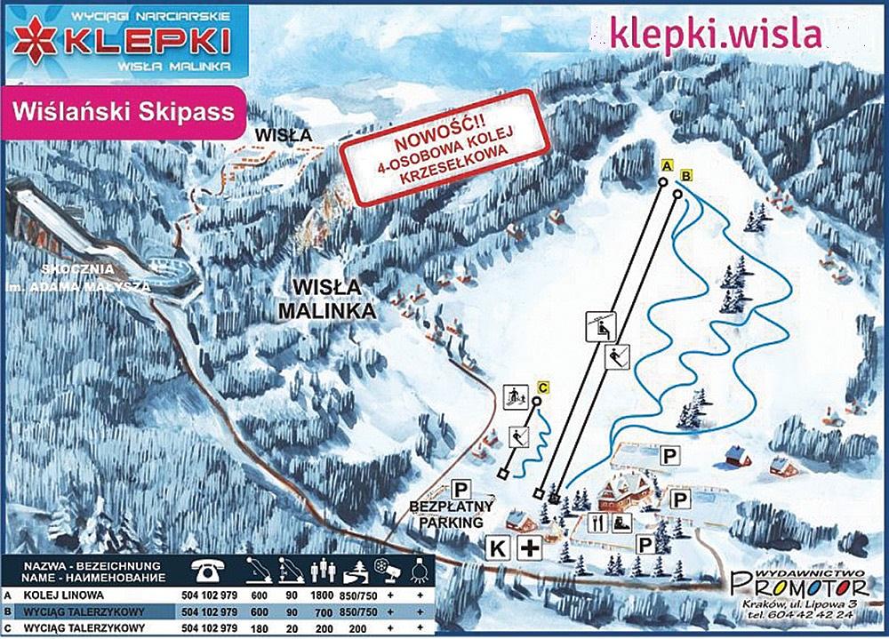Ośrodek Narciarski Klepki - Wisła Malinka is a ski resort in Wisła, Poland, offering 1.8 km of slopes for skiing and snowboarding. It features a chairlift and two surface lifts, with a vertical drop of 82m. The resort is suitable for beginners and families, with a variety of slopes and illuminated runs for night-time skiing. It also offers snowboarding lessons and a restaurant on site.