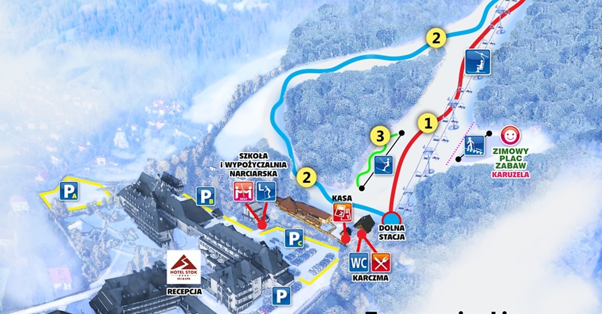 Stok ski resort in Wisła, Poland offers 1.9 km of slopes for skiing and snowboarding, with 2 lifts transporting skiers. The resort has a 4-star hotel, Hotel Stok, which features a swimming pool, spa, and ski-in/ski-out access. The hotel also offers a winter playground for children. The resort is surrounded by the Beskid Śląski mountain range and offers a variety of terrain for all skill levels.