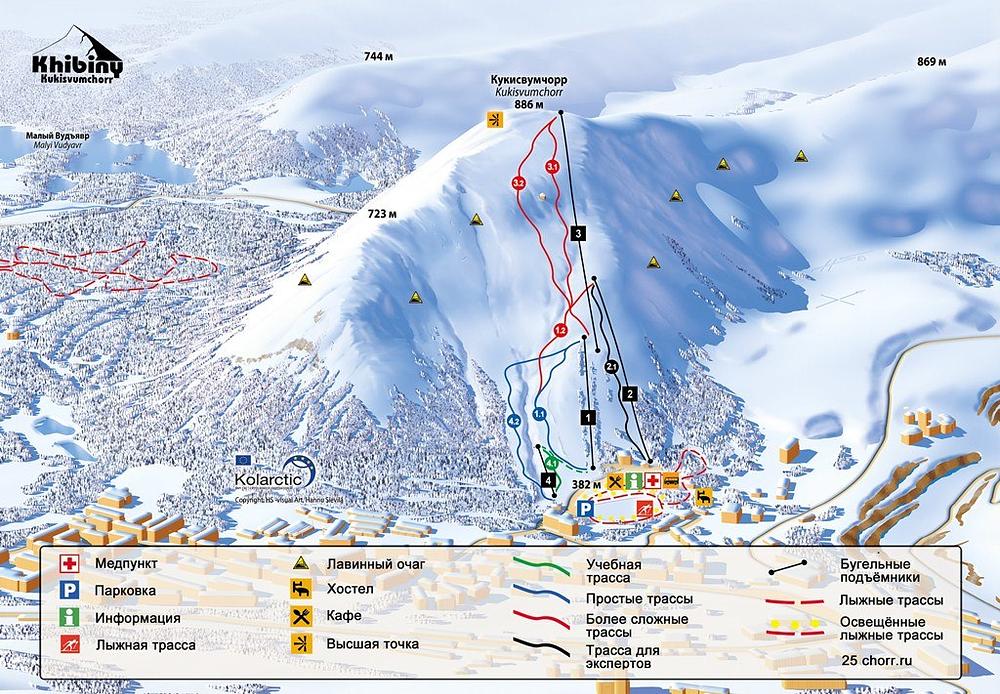 Kukisvumchorr is a ski resort located in Kirovsk, Murmansk Oblast, Russia. It offers 6 km of slopes for skiing and snowboarding, with three T-bar lifts and a free baby-lift. The resort is open from late November to mid-May, making it a popular destination for winter sports enthusiasts. The area is known for its beautiful mountains and natural scenery, with many ski slopes and opportunities for skiing and snowboarding with friends.