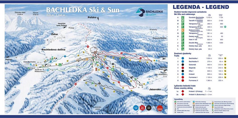 Bachledova dolina is a ski resort located in the Spišská Magura Mountains, Slovakia. It offers a variety of challenging runs, an ice rink, equipment rentals, and lodging. The resort is situated near the town of Ždiar and has a chairlift that connects three valleys: Bachledova dolina, Malá Franková, and Jezersko. The resort offers 8.5 km of slopes for skiers and snowboarders of all levels, with a total of 10.8 km of slopes available.