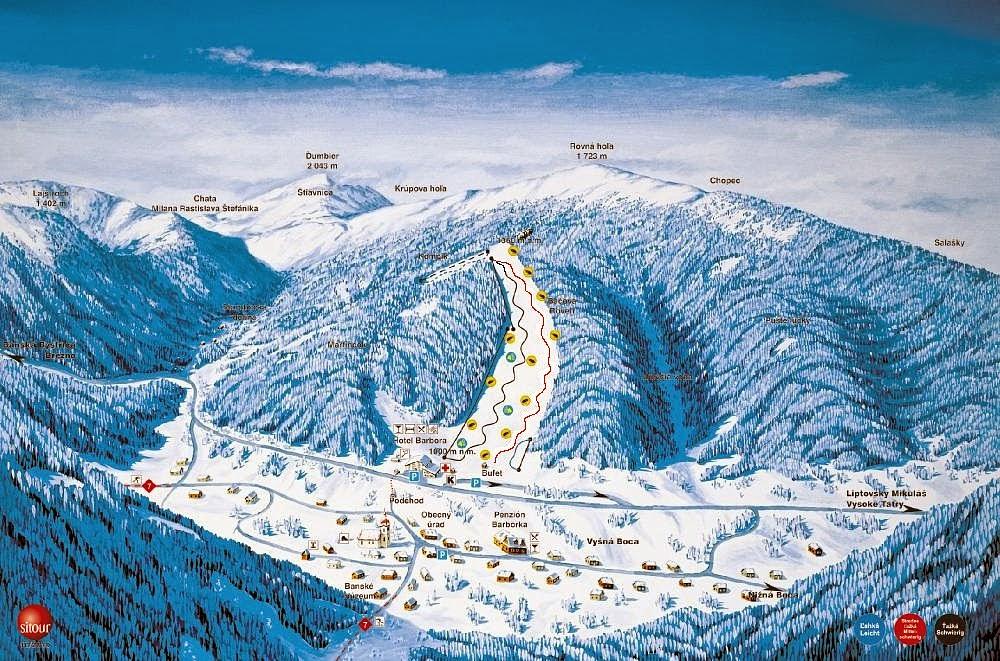 Bačova Roveň is a ski resort located in Vyšná Boca, Slovakia, in the Low Tatras mountain range. It offers 3 km of slopes with varying levels of difficulty, suitable for all categories of skiers. The resort has 3 lifts, including a baby lift, and can accommodate 1800 people per hour. The slopes have a total length of 1.96 km. The resort is situated near Hotel Barbora and offers a range of amenities, including a restaurant.