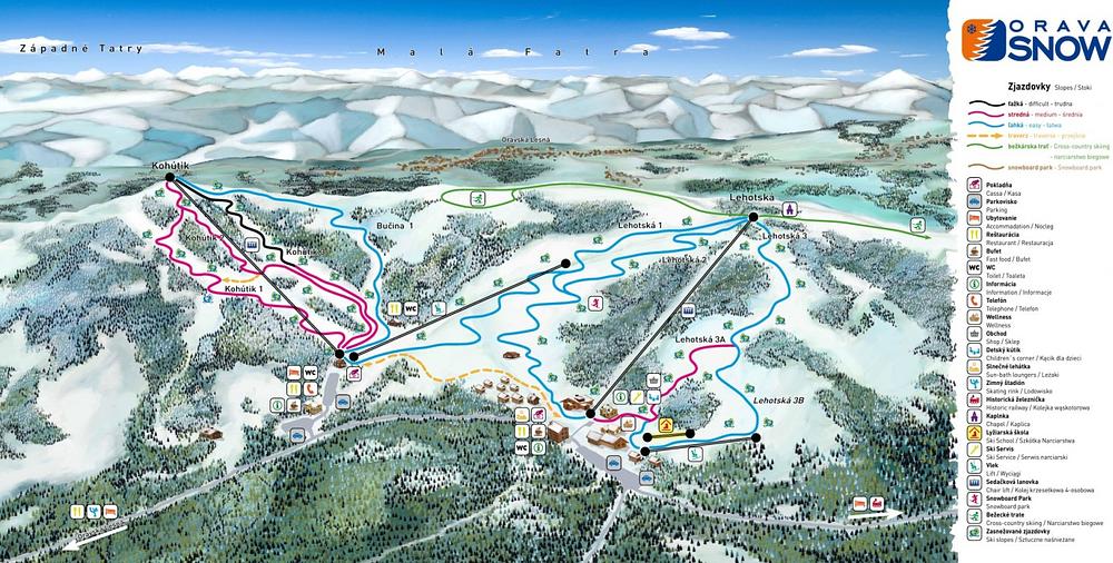Orava Snow is a ski resort located in Oravská Lesná, Slovakia, in the Orava region of the Orava Beskid Mountains. It offers 7.6 km of slopes, 5 lifts, and 7 pistes with a total length of 8.6 km, including 2.5 km of artificial snow. The resort is suitable for all skill levels, including families, and provides a family-friendly atmosphere. The area is known for its well-maintained ski slopes and stunning mountain vistas.